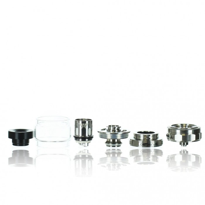 The included Cerberus Sub-Ohm Tank features a stunning stainless steel design, with a 5.5mL E-Juice reservoir, top-fill refilling system, and a dual adjustable bottom airflow design for preference customization. The included 0.2ohm kanthal mesh coils guarantee improved flavor and cloud production, along with upgraded longevity of use.