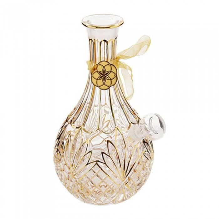 This thick textured glass decanter features hand-painted gold detailing with a matching stopper. She comes with a large clear bubble bowl and an ivory pearl anemone flower poker. This piece is everything you're looking for in a decorative My Bud Vase to add a sparkle to all your festivities!!