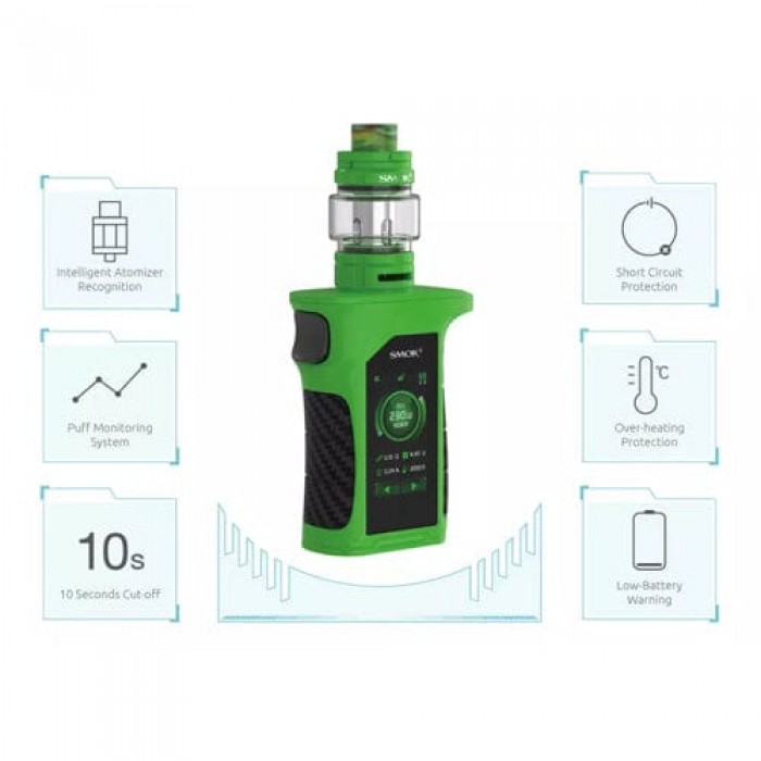 The SMOK MAG P3 Kit features a smart IQ-M chipset, can fire up to 230W, and has a 0.001-second flash firing speed. This device also features a stealth mode for power saving as well as several other modes, a trigger firing button, and features an optional pass code lock on the 1.9" HD touch screen.