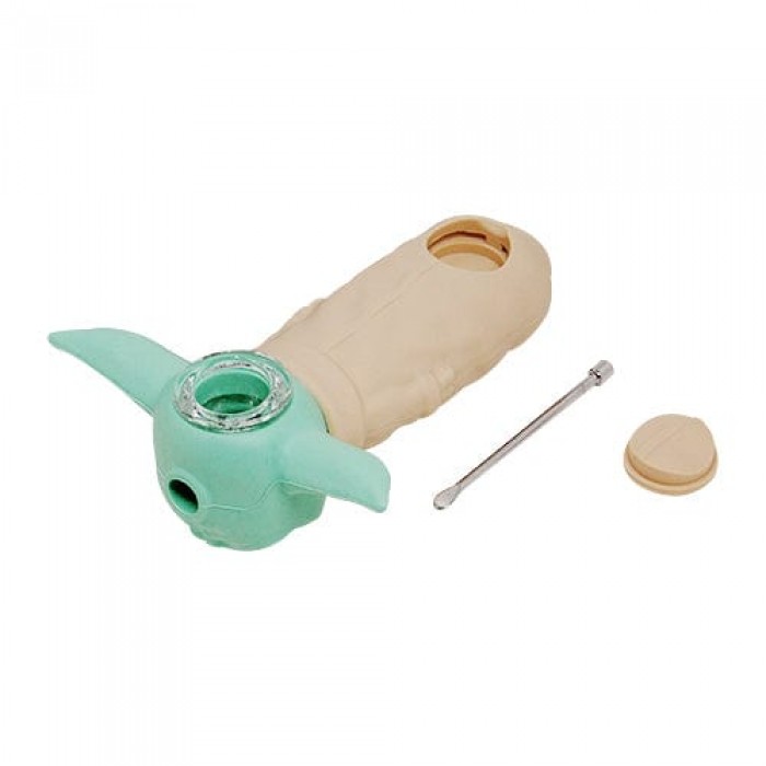 Have This Pipe You Must...save your own foundling with this Yoda silicone hand pipe! Featuring an ambidextrous carb hole and glass bowl insert for easy cleaning, this pipe is built for the long haul. This piece also comes with a small dab tool and a built-in stash jar to keep a small nug or some concentrate!